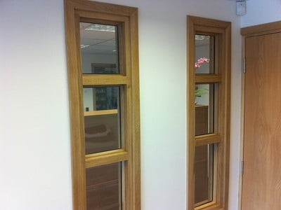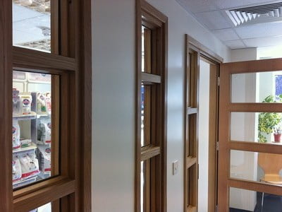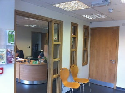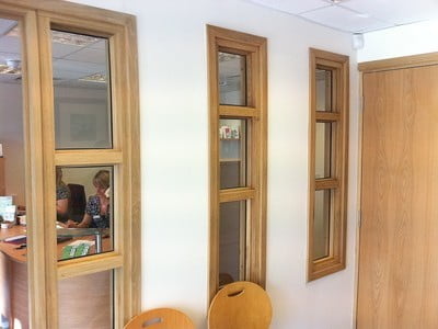 The reception area consisted of a solid American white oak combination screen with a matching oak veneered door with factory fitted glazing alongside 2 purpose made solid oak frames with matching glazing panels.